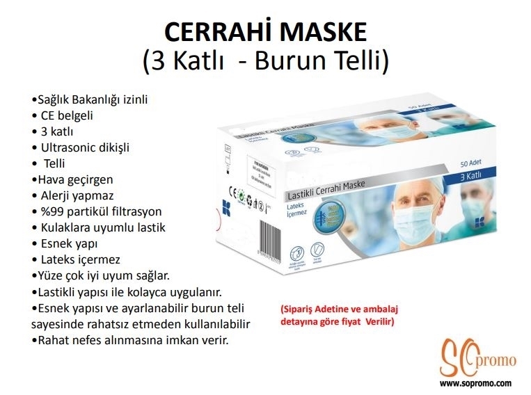 Cerrahi Maske, 3 katlı, telli tüm belgeleri mevcut.